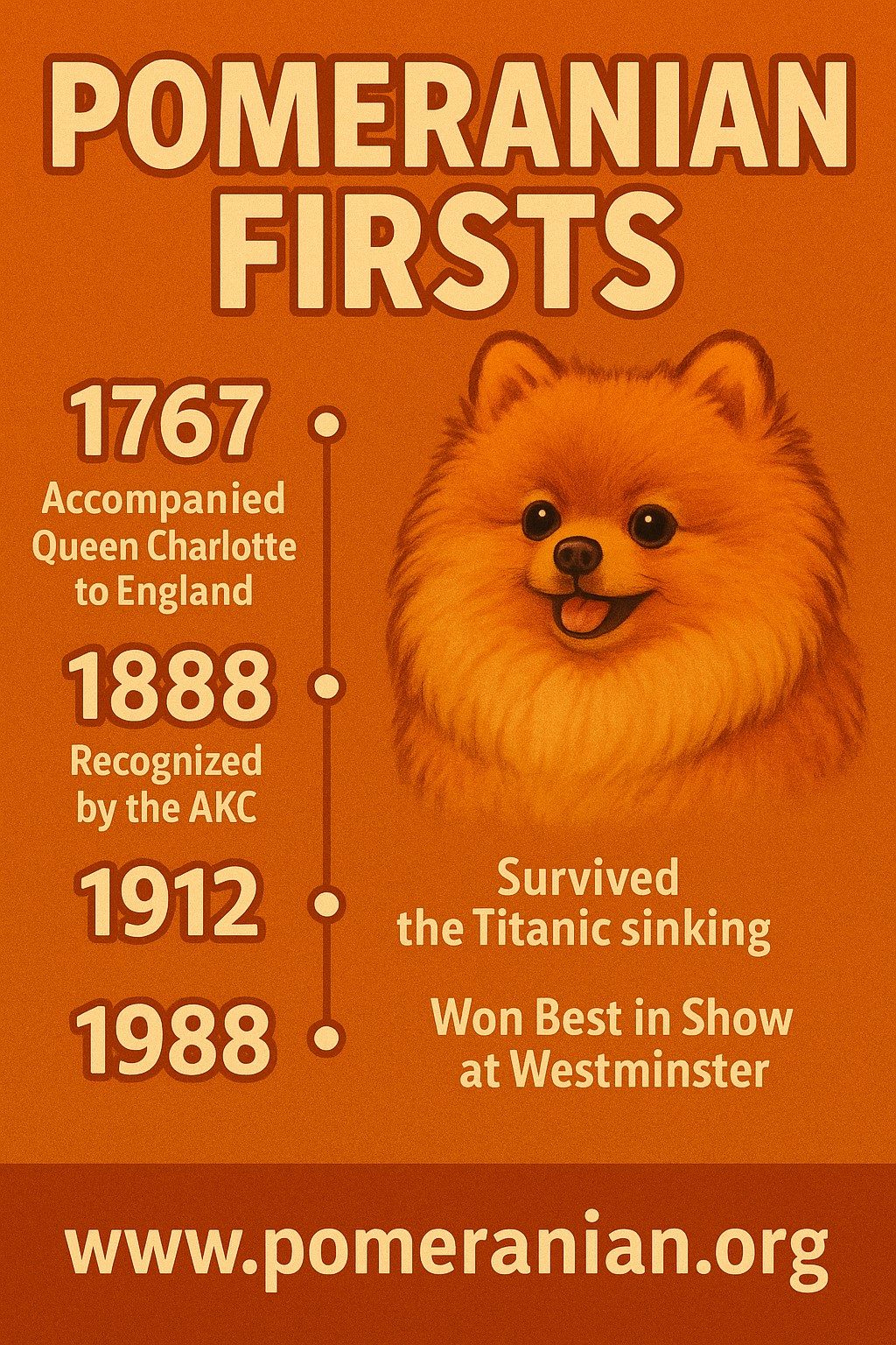 This page celebrates the “firsts” — the groundbreaking moments, historic achievements, and fascinating trivia that highlight the evolution of the Pomeranian. Whether it’s the first champion, the first specialty show, or the first Pom to survive the Titanic, these pioneering pups paved the way for the breed’s enduring popularity.